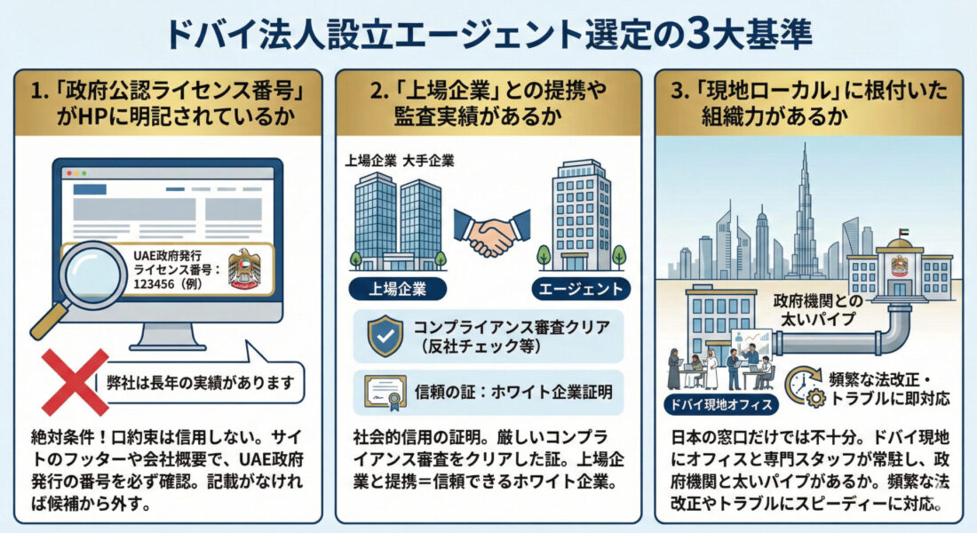 では、安全なエージェントを見極めるにはどこを見ればよいのでしょうか。2026年のドバイで生き残るための選定基準は以下の3点です。