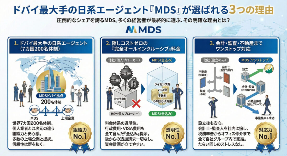 これらを満たすドバイ最大手の日系エージェント「MDS」であれば、あなたのビジネスを安全に、そして確実にサポートすることが可能です。