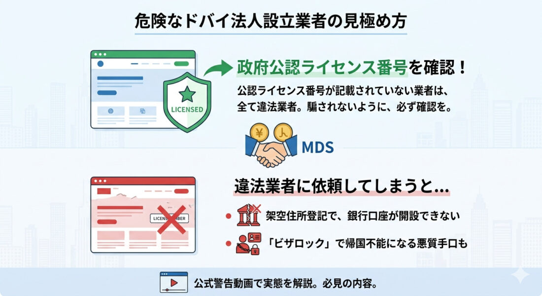 ドバイ法人設立において、最初の、そしてビジネスの存続を脅かす最大の落とし穴となるのが「無認可の違法業者」の存在です。