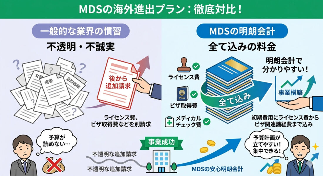 MDSは全て込みの料金です。 初期費用にライセンス費用からビザ取得に関わる諸経費までが含まれた明朗会計となっているため、後から理由をつけて追加請求される心配が一切ありません。