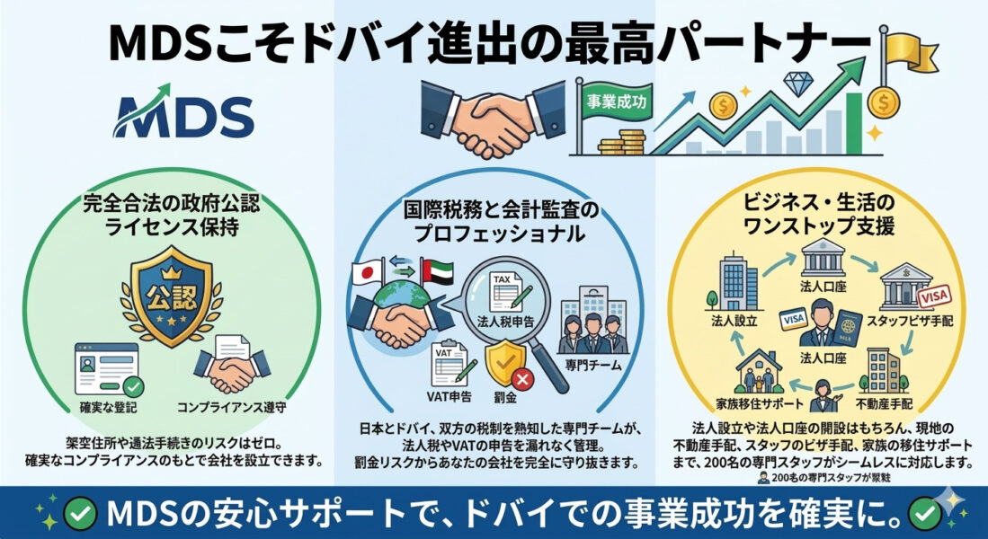 MDSはドバイ最大手の日系法人設立、会計、監査、不動産エージェントです。 単なる「手続き代行屋」ではなく、ドバイ進出におけるあらゆる課題を解決する総合コンサルティングファームとして機能しています。