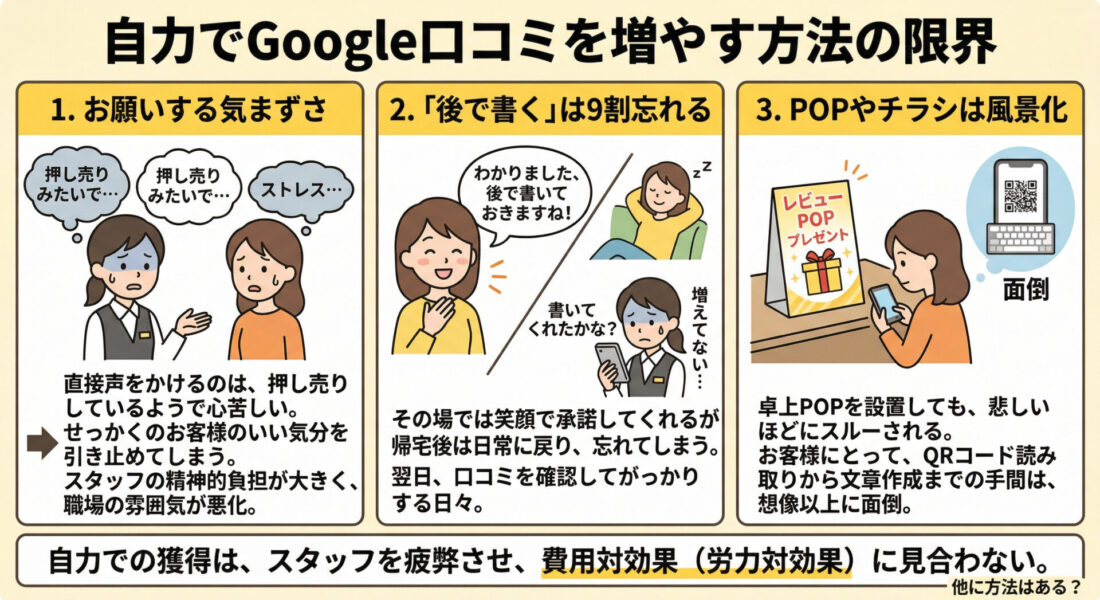 悪気があるわけではなく、日常に戻れば忘れてしまうのが普通なのです。結果、「あのお客様は書いてくれるはず」と期待しては、翌朝Googleマップを見てがっかりする日々が続きました。