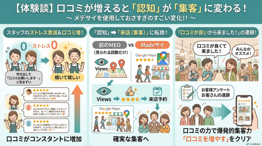 口コミ集めに疲弊し、本気で集客の柱を作りたい店舗オーナー様は、ぜひ一度マデサイのMEOを試してみてください。お客様の反応が変わり、毎日の売上を見るのが楽しみになるはずです!