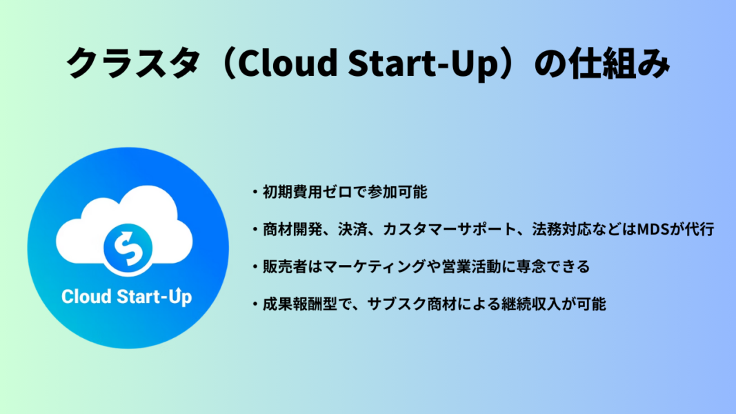 クラスタとは、MDSが開発・提供する商品やツールを自分のブランドで販売できる代理店制度です。特徴は以下の通りです。