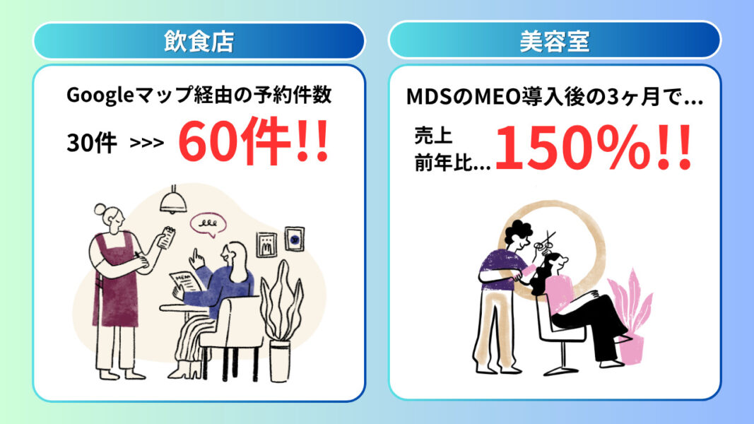 東京都内の美容室Aサロンでは、導入前にはマップ検索順位が10位前後で新規集客が伸び悩んでいましたが、MDS導入後の3ヶ月でGoogleマップでトップ3に入り、来店数が3倍、売上は前年比150%に伸長しました。