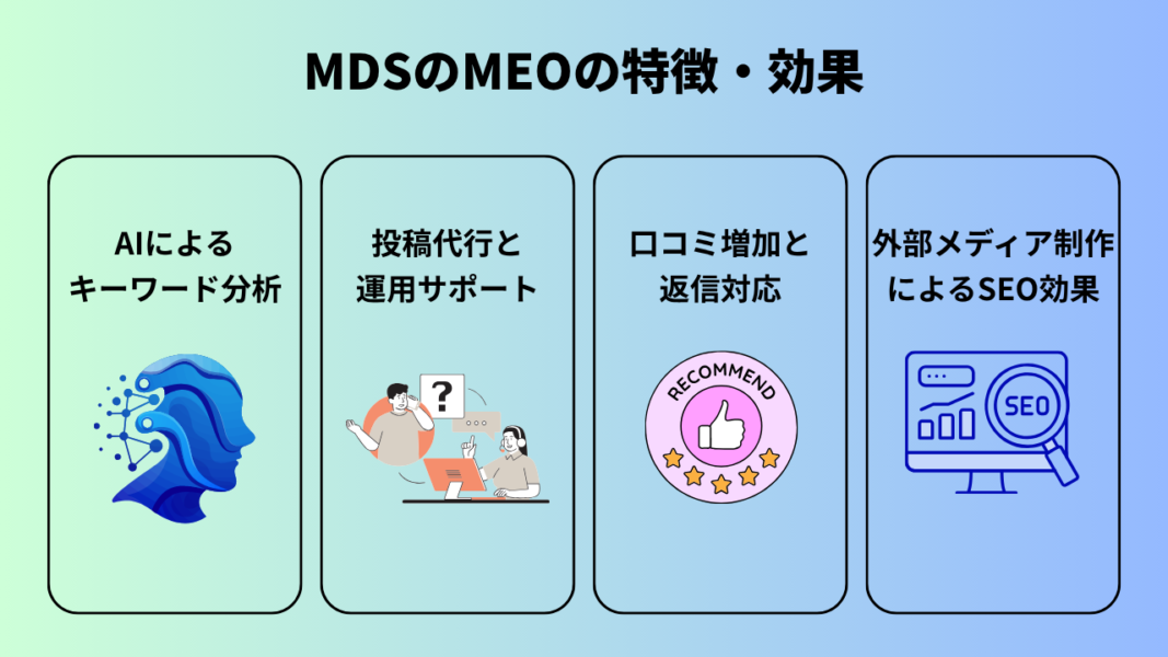 MDSは国内外のマーケティング知見を活かした手厚いサポート体制を整えており、MDSのMEOサービスは、AI分析や口コミ対策などを組み合わせ、店舗のGoogleマップ集客をワンストップでサポートしています。