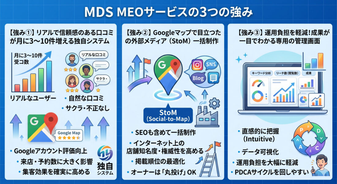 MDSのサービスは、ただツールを提供するだけでなく、忙しいオーナー様に代わって集客の最適化を丸ごとサポートしてくれます。ここでは、その強力な3つの強みを解説します。