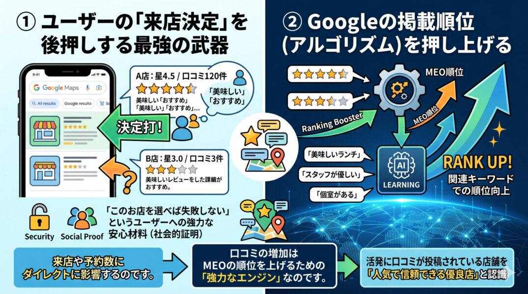 Googleマップを使った集客(MEO対策)を成功させる上で、なぜこれほどまでに「口コミ」が重要視されるのでしょうか。その理由は、大きく2つの視点から説明できます。